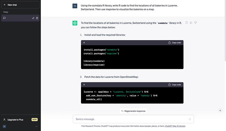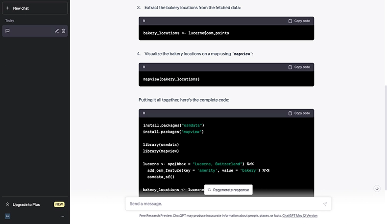 Um R-Code mit ChatGPT schreiben zu können, ist zumindest ein gewisses Grundverständnis des R-Ökosystem unabdingbar. ChatGPT benötigt klare Anweisungen, inkl. der notwendigen Pakete, um korrekten Code schreiben zu können.