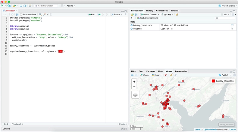 This code will fetch the bakery locations in Lucerne, Switzerland using the 'osmdata' library and then display them on a map using 'mapview'.