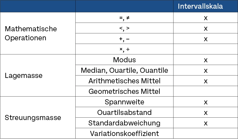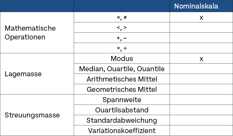 Die drei Skalenniveaus, Nominal-, Ordinal- und metrische Skala, lassen sich in eine Reihenfolge einordnen. Das heisst, je höher sie eingeordnet werden, desto grösser ist der Informationsgehalt. Ausserdem steigt damit auch die Anzahl der mathematischen Operatoren, die auf die Daten angewandt werden können.