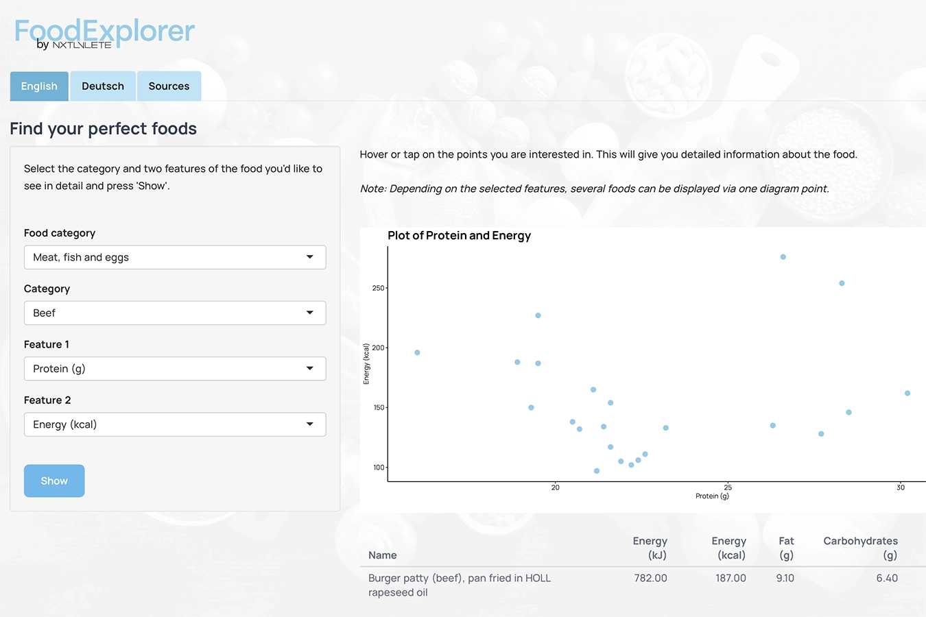 Die mit R Shiny erstellte Webapplikation lässt den Anwender die Nährwerte von über 1000 Lebensmitteln anzeigen und einen Ernährungsplan nach dem persönlich Energiebedarf zusammenstellen.